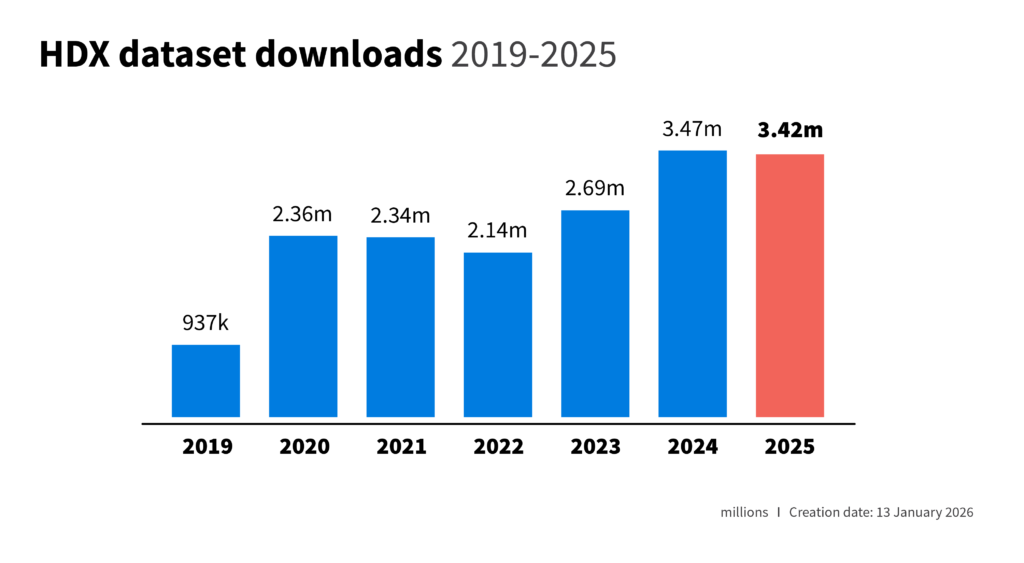We are grateful to all of our partners for their collaboration and commitment to making humanitarian data easy to find and use. We will provide more insights about the data on HDX, the impact of funding cuts, and what to do about AI bots in The State of Open Humanitarian Data 2026 report, which will be released in March.
